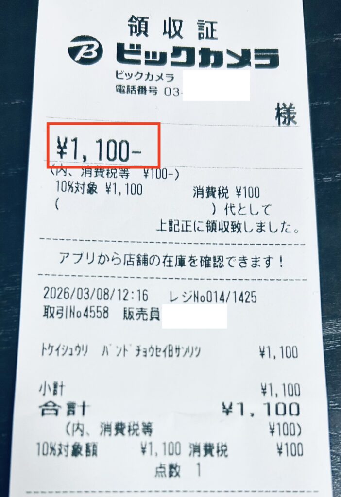 ビックカメラで交換。待ち時間は約30分、1,100円(税込)で対応していただきました。