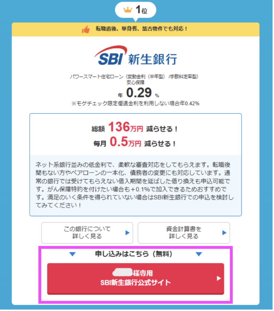 診断結果には「〇〇様専用 SBI新生銀行公式サイト」というボタンが表示されていました。クリックしてみたところ、特別感はあまりなかったのですが、引き下げ幅などが個人によって異なる表示になっているのかもしれません。