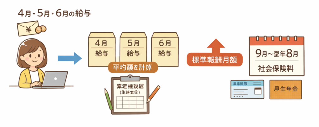 4〜6月の給与額によって、9月から翌年8月までの社会保険料が決まる仕組みになっています。